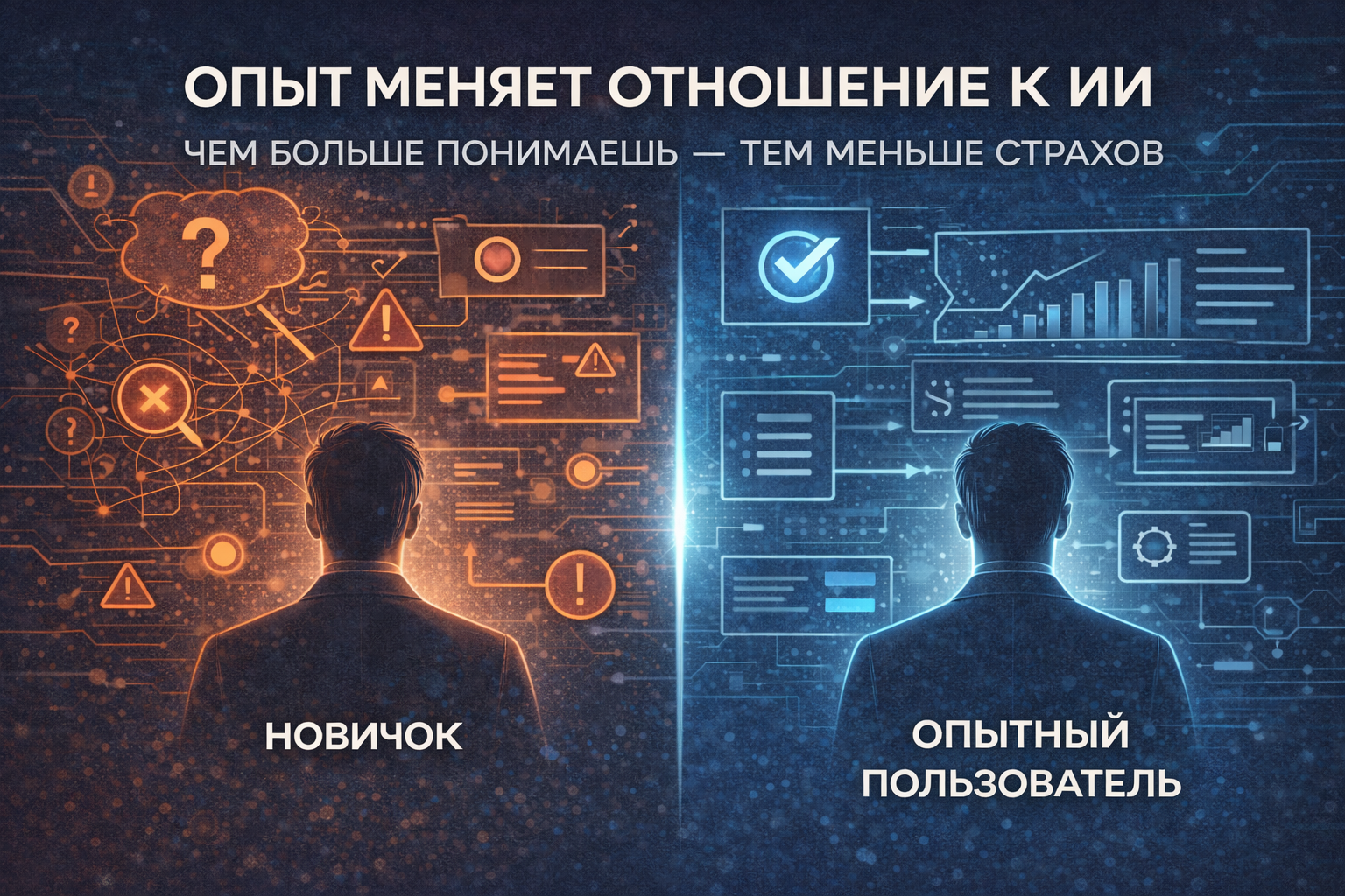 Скорее всего, те, кто уже пользовался нейросетями, оценивают их иначе, чем те, кто сталкивается с ИИ только в медиа. Такой разрыв формирует разные ожидания — от «ИИ всё решит» до «ИИ опасен».